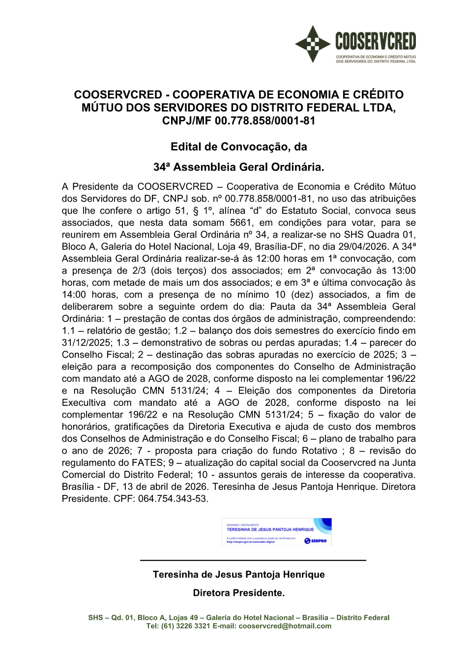 A COOSERVCRED é uma Instituição financeira fundada em 1995, clássica, independente, sediada em Brasília – DF, com objetivo de prestar serviços adequados às necessidades financeiras dos seus cooperados. Para tanto se propõe a realizar com segurança, operações financeiras para atender as demandas dos associados com excelência no relacionamento e ações transformadoras.